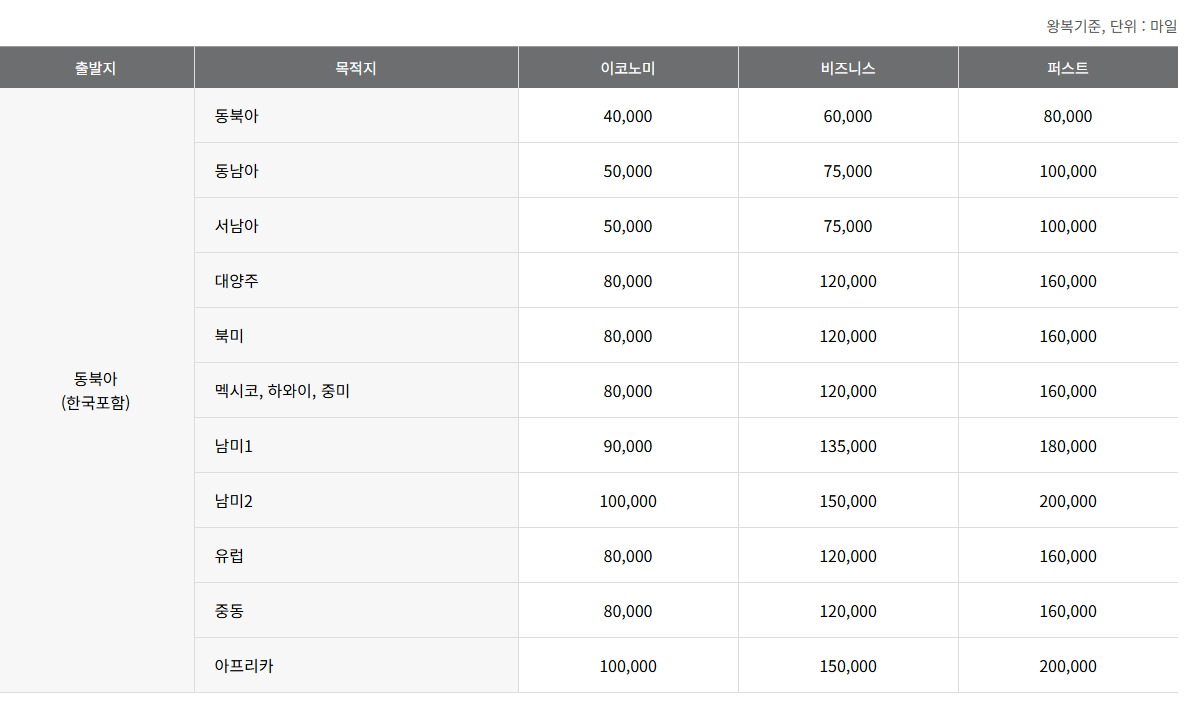 - 마일리지 항공권은 현금으로 환불되지 않으며, 판매 및 교환 절대 불가함.