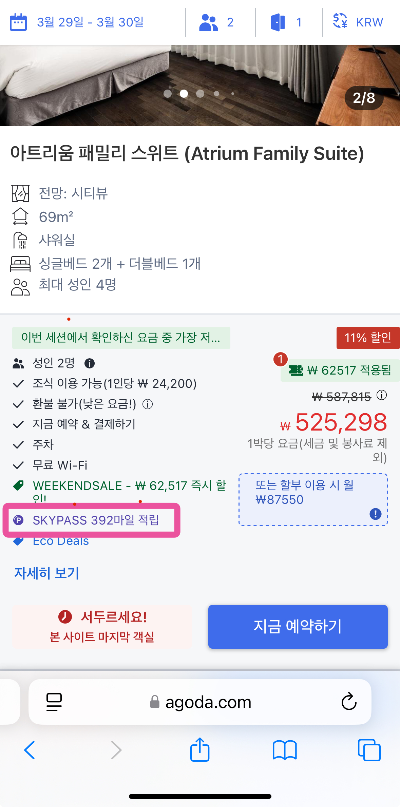 스카이패스 적립가능한 호텔은 꽤 많은데요, 이 정보를 알기 전까지 마일리지 적립을 못하고 호텔을 예약한 게 너무 아깝다는 생각이 드네요!!