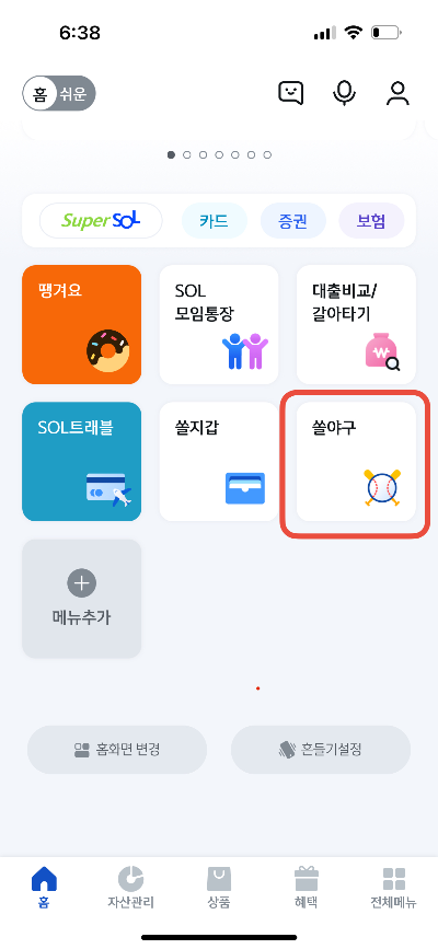 - 메인화면에서 아래로 스크롤을 내리면 '쏠야구' 서비스 확인 가능