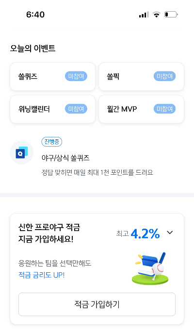 2025년 올해에는 기존 고객 참여형 콘텐츠에 금융을 결합해 고객이 금융 거래를 하면 다양한 혜택을 제공하는 미션 스코어 기능을 추가했습니다. 요즘 금리도 낮은데, 프로야구 적금 금리가 최고 4.2%나 되네요. 저도 이 기회에 야구 적금 하나 가입해야겠습니다!